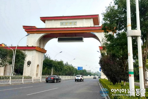 | 중국 북경 외곽 三河本區 행정구역 경계에 세워져 있는 건축물 아래 차량들이 달리고 있다.(사진=장용) |