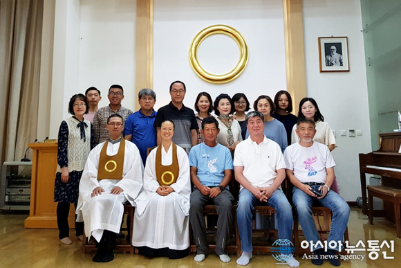 | 중국 북경에서 몇 일 쉬면서 원불교 교당을 찾아 법회에 참석한 후 기념사진을 찍고 있다.(사진=장용) |