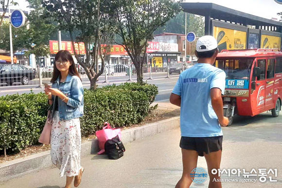 | 중국 북경 외곽을 달리며 지나치고 있는 젊은 여인과 삼륜 택시가 이국적인 모습을 보인다.(사진=장용) |