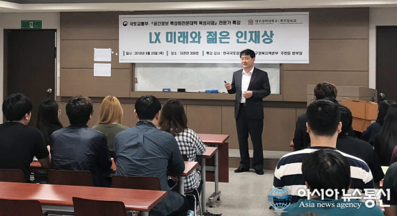 영남권 유일 국토교통부 '공간정보 특성화전문대학 육성사업' 선정 대학인 대구과학대학교(총장 박준)는 20일 측지정보과 남북교류협력세미나실에서 재학생 취업역량강화를 위해 주한돈 한국국토정보공사(LX) 대구.경북지역본부장을 초청해 특강을 실시했다.