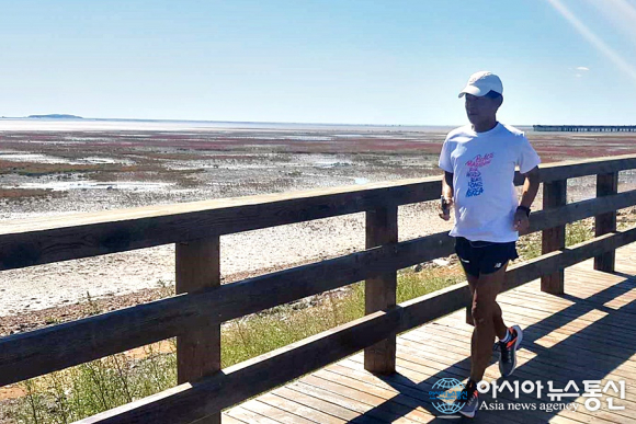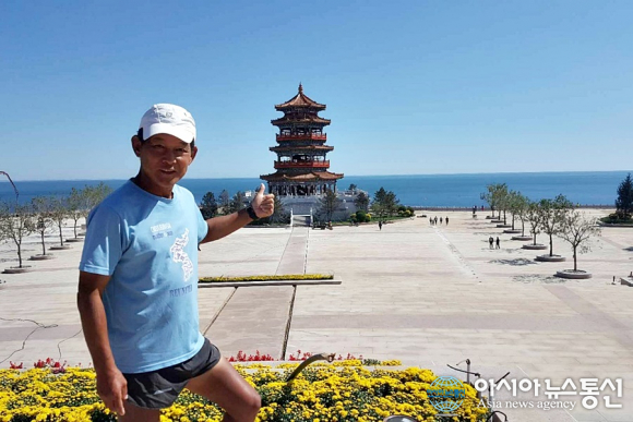 | 추석 무렵 중국 랴오닝성(遼寧省) 진저우(錦州) 지역을 달리고 있는 강명구 평화 마라토너.(사진=장용) |