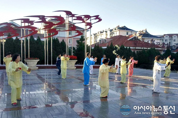 | 월요일이지만 공휴일인 중추절 아침 공원에 모여 기공 체조하는 중국 랴오닝성 사람들.(사진=강명구) |