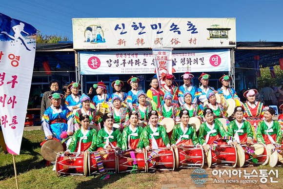 | 강명구 마라토너와 평마사 대표단이 신한민속촌에서 환영행사후 기념사진을 찍고 있다.(사진=평마사) |