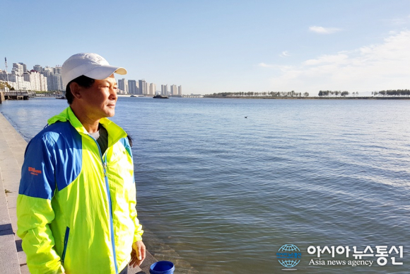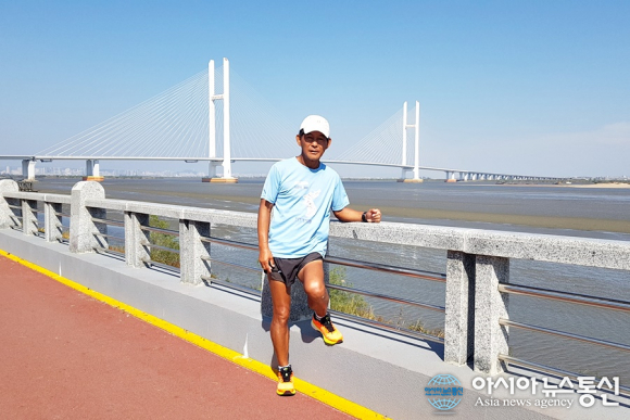 | 400여 일만에 10여 개국 1만 4000여 km 유라시아대륙을 횡단해 압록강을 바라보는 필자.(사진=평마사) |