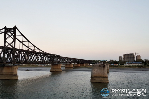 | 중국 단동 압록강에 철교와 단교, 강건너 북한이 짓고 있는 호텔이 보이고 있다./아시아뉴스통신DB |