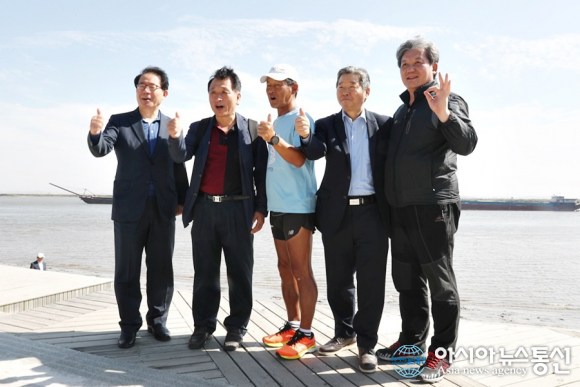 | 중국 랴오닝성(遼寧省) 푸순(撫順)에 있는 신한민속촌에서 열린 강명구 마라톤 환영행사.(사진=평마사) |
