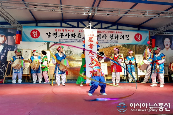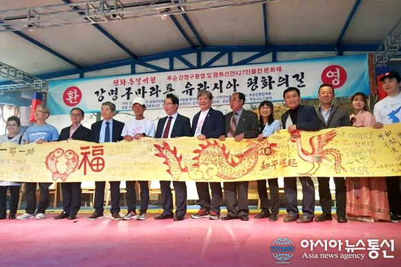 벌써 교포들로 구성된 풍물패와 교포들로 꽉 차 있었고 입구에는 ‘환영 강명구 마라토너의 유라시아 평화의 길’이라는 현수막이 나를 반가이 맞아주었다.