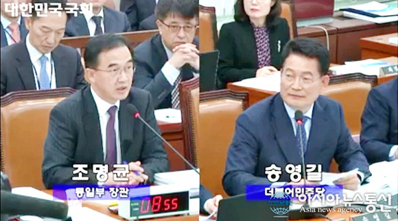 | 국정감사서 강명구 선수에 대해 질문하고 답변하는 송영길 의원과 조명균 통일부장관.(사진=국회방송) |