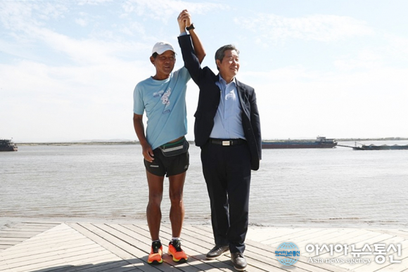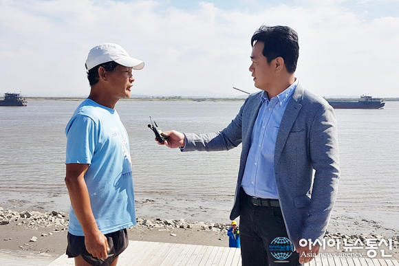 | 중국 단동 압록강변에서 인터뷰하는 강명구 마라토너와 KBS 김명주기자./아시아뉴스통신=홍근진 기자 |