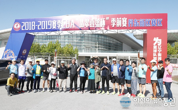 | 중국 단동 황금평 서문 앞 체육관에서 사진을 찍는 강명구 선수와 응원단./아시아뉴스통신=홍근진 기자 |
