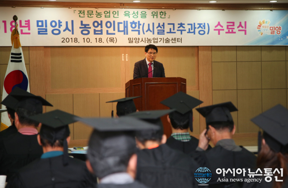 경남 밀양시는 18일 농업기술센터 대강당에서 농업인대학 교육생과 관계자 70여명이 참석한 가운데 '2018년 농업인대학 시설고추과정 수료식'을 가졌다.