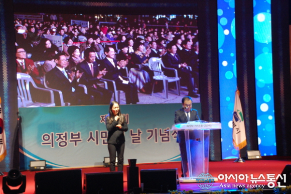 | 19일 오후 의정부의 시 승격 55주년과 제47회 시민의 날을 기념하는 행사가 경기북부청사 앞 광장에서 화려하게 펼쳐졌다. 또, 이날 행사에서는 민선 7기 비전을 담은 '100년 먹거리 창출 희망도시 의정부 완성'을 알리는 선포식도 함께 진행됐다. 특히 행사에는 문희상 현 국회의장 내외가 함께 참석했다. 문 의장은 "시민여러분 이 문희상이가 대한민국 국회의장이 되서 의정부로 돌아왔다"고 말해 시민들의 축하의 환호와 박수가 이어졌다./아시아뉴스통신=고상규 기자 |