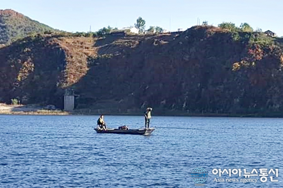 | 수풍댐 아래서 탄 유람선 옆으로 노를 저어가는 고기잡이 배 한 척이 한가롭게 지나간다.(사진=강명구) |
