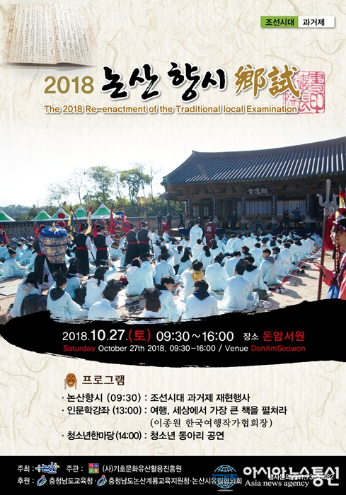 (사)기호문화유산활용진흥원이 주관하고 논산시·충청남도교육청·충청남도논산계룡교육지원청·논산시유림협의회가 후원하는 이번행사는 조선시대 과거제의 1차 시험에 해당하는 향시는 초등부, 중·고등부, 대학 및 일반부로 구분해 시험을 실시하며, 적정한 수준의 한자 시험과 한글 글짓기 실력을 겨룬다.