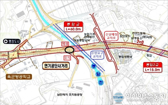 | 행복청이 폐쇄키로 한 연기공단 진입로와 주민요구 교차로, 신설예정 교차로 위치도.(사진출처=행복청) |