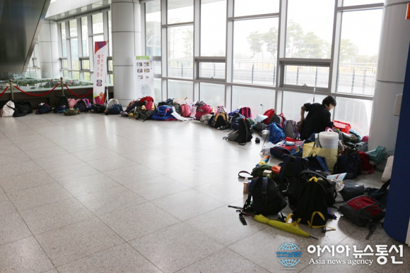 세종시 정부컨벤션센터 교육축제장에 학생들이 놓고간 가방들이 모여있다./아시아뉴스통신=홍근진 기자