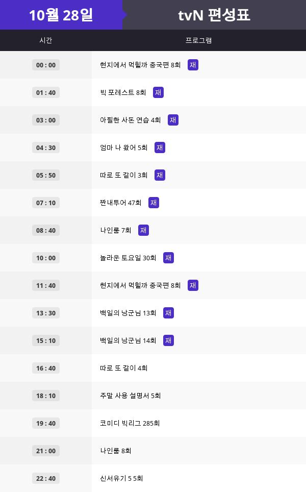 ▼10월 28일 , 일요일 tvN 전체 편성표 정보