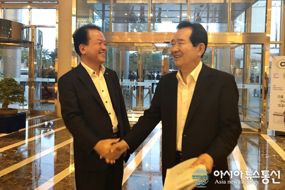 | 이강준 세종시 정무부시장(왼쪽)이 국회 현관에서 정세균 전 국회의장과 악수하고 있다.(사진제공=세종시청) |
