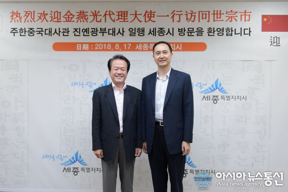 | 이강준 세종시 정부부시장(왼쪽)이 지난 8월 진옌광 주한 중국대사관 부대사를 만나고 있다.(사진=세종시청) |