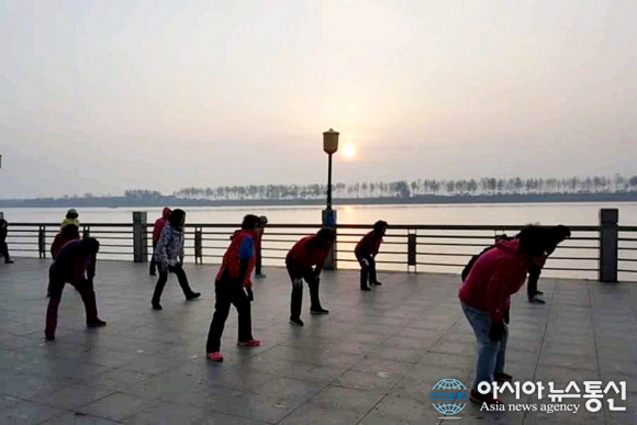 | 입북을 기다리는 동안 단동 압록강변에서 달리기를 하다가 만난 체조하는 중국 사람들.(사진=강명구) |