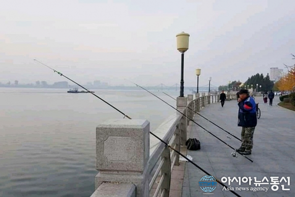 | 입북을 기다리는 동안 단동 압록강변에서 아침 운동 하다가 만난 낚시하는 중국 사람들.(사진=강명구) |