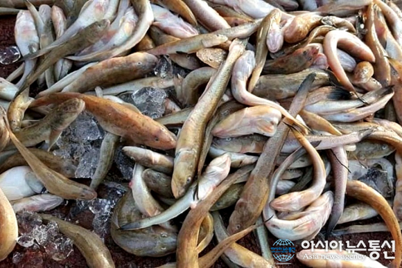 | 입북을 기다리는 동안 단동 압록강변에서 아침 운동을 하다가 갓 잡은 물고기들을 봤다.(사진=강명구) |
