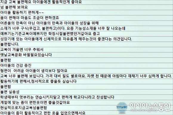 참학은 편한교복이 필요하다는 의견에는 "아이들이 의자에 앉아 있는 시간이 긴데 현재 교복은 아이들의 성장에도 문제가 되는 것 같다", "너무 꽉 조여서 불편해요", "비싸기만한 외투, 보여지기식 교복은 이제그만" 등 비효율적인 현재 교복에 대한 비판적 의견이 다수를 이뤘다고 설명했다.
