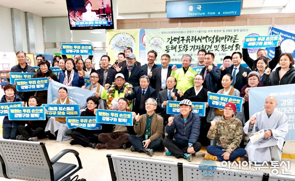 강명구 평화마라톤을 사랑하는 사람들(이하 평마사)은 15일 강명구 평화마라토너가 강원 동해항으로 일시 귀국해 기자회견과 환영행사를 가졌다고 16일 밝혔다.