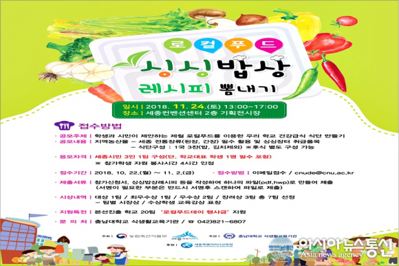 시에 따르면 이번 대회는 '학생과 시민들이 제안하는 로컬푸드를 이용한 학교 건강급식 식단 만들기'를 테마로 농림축산식품부와 함께 주최하고 충남대 식생활교육기관이 주관한다.