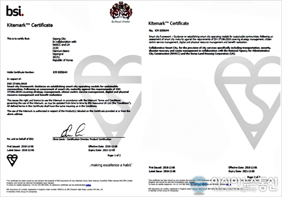 10일 행복도시건설청과 세종시, 한국토지주택공사(LH) 등 3개 기관에 따르면 시는 영국표준협회 인증심사에서 비전, 로드맵, 서비스, 첨단 자원, 개방형 플랫폼, 시민혜택 등 22개 항목에서 평균 성숙단계 이상으로 평가돼 이날 인증서를 받았다.