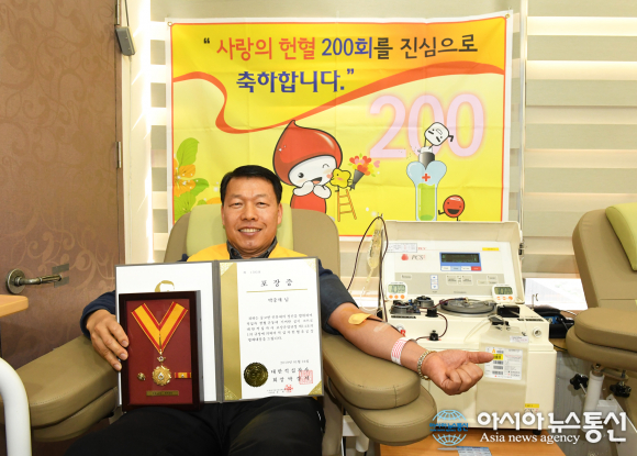 해군 잠수함사령부 수리창 박중재 서기관이 24일 창원 헌혈의 집에서 헌혈 200회를 달성, 대한적십자사로부터 헌혈 명예대장을 받았다.