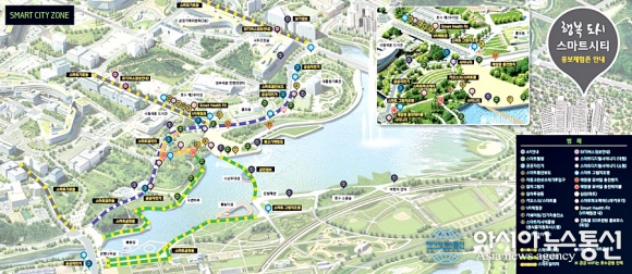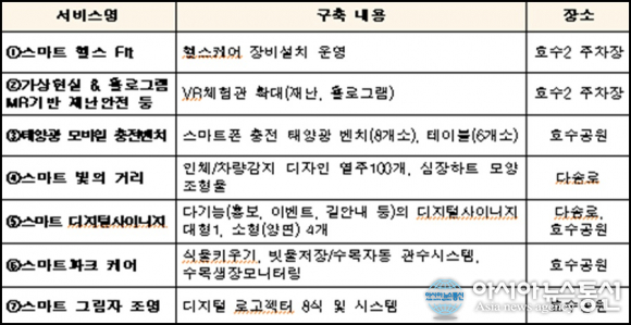 추가되는 서비스는 뇌파와 맥파 생체신호를 측정해 스트레스와 두되 건강을 분석하는 '스마트 헬스 Fit', 재난안전 가상현실, 태양광 모바일 충전 벤치와 테이블, 스마트 빛의 거리 등이다.