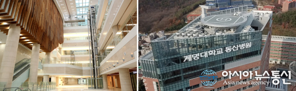 | 왼쪽은 빛과 자연을 담은 1층 로비, 오른쪽은 옥상에 설치된 헬리포터.(사진제공=계명대 동산의료원) |