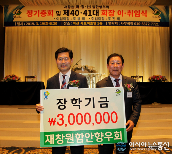 또한 향우회에서는 축하화환 대신 받은 백미 17포(10㎏) 및 고향의 인재육성을 위해 (재)함안군장학재단에 장학기금 300만 원을 전달했으며, 2011년부터 7년간 꾸준히 장학기금을 전달해 현재까지 총 2400만원을 기탁했다.