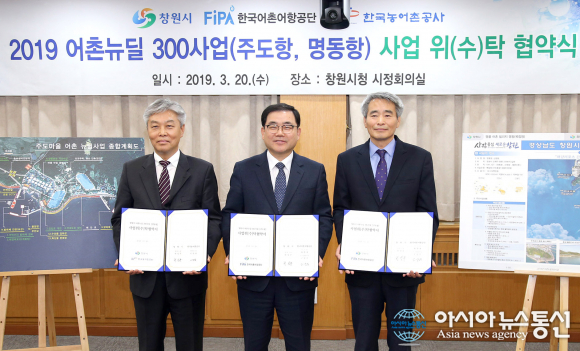 경남 창원시(시장 허성무)는 20일 시청 시정회의실에서 ‘2019년 정부공모사업’으로 선정된 어촌뉴딜300사업의 성공적인 추진을 위해 한국어촌어항공단, 한국농어촌공사와 사업 위∙수탁 협약을 체결했다.