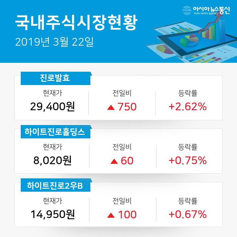 22일 종가 기준 음료업종 상승률 상위 종목에는 진로발효, 하이트진로홀딩스, 하이트진로2우B 등이 있었다.