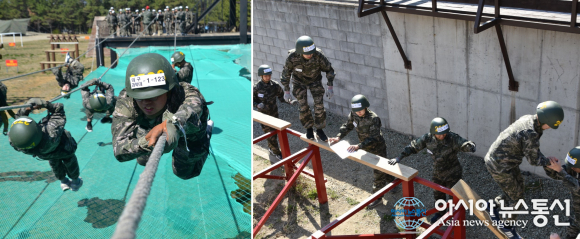 대구과학대 국방기술행정과 학생들이 포항 해병대교육훈련단에서 실시한 해병대 병영체험에서 유격기초훈련을 하고 있는 모습(왼쪽)과 팀리더십훈련을 하고 있는 모습(오른쪽).(사진제공=대구과학대학교)