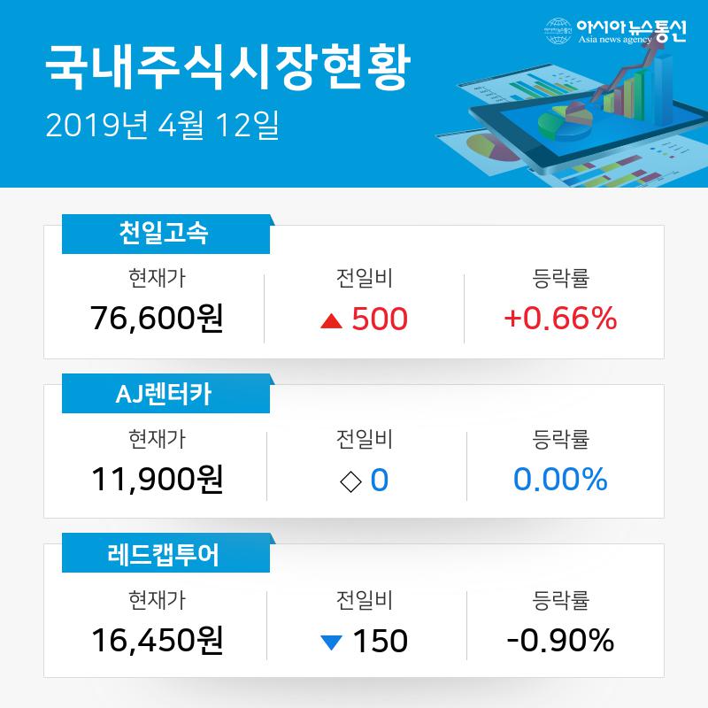 12일 13시21분 현재 도로와철도운송업종 상승률 상위 종목으로는 천일고속, AJ렌터카, 레드캡투어 등이 있다.