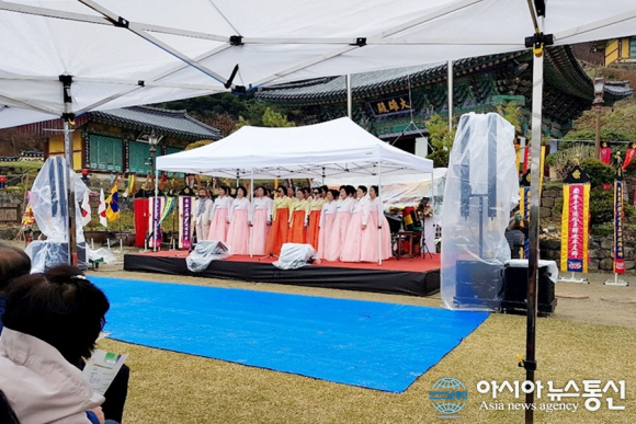 | 14일 비가 내리고 있는 가운데 세종시 전의면 비암사에서 백제 멸망기인 지난 673년 유민들이 역대 국왕 및 대신과 백제 부흥을 위해 숨진 이들의 극락왕생을 기원하는 재를 올린데서 유래한 1346년차 '백제 영산대재(靈山大齋)'가 열리고 있다./아시아뉴스통신=홍근진 기자 |