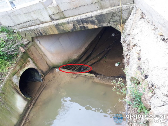 | 반토막난 물 저장시설물 하류에 마을 주민들이 설치해 사용하고 있는 호스(빨간색)./아시아뉴스통신=조용호 기자 |