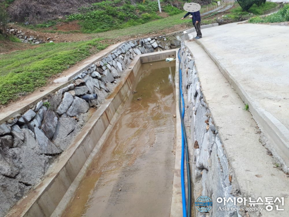 실재 현장을 찾아 확인한 결과 군에서 반토막 낸 콘크리트 시설물을 사용하지 못하고 하천 하류 쪽에 주민들이 농삿물로 사용하기 위해 소하천에서 흐르는 물을 막고 그 자리에 물 호스를 설치해, 메마른 농토에 물을 주고 있었다.