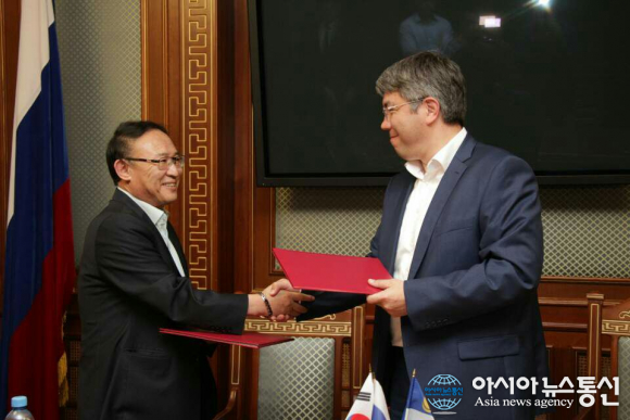 | (사진= 러시아 연방 부랴트 공화국의 알렉세이 쯔데노브 대통령(오른쪽)과 한국의 지오그룹 우태광 회장이 바이칼지역 개발을 목적으로 하는 MOU를 체결하고 있다.) |