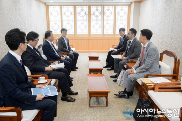 | 이강진 세종시 정무부시장(왼쪽 세번째)은 16일 시청에서 '테드 로스(Ted Ross)' 미국 로스엔젤레스 시 정보화 분야 부시장(오른쪽 두번째)을 만나 스마트시티 협의체 구성 및 상호 교류 협력 방안을 논의하고 내년에 세종서 열리는 '제1회 세종 스마트시티 국제 포럼'에 정식 초청했다.(사진제공=세종시청) |