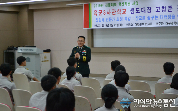 대구과학대학교(총장 박준) 국방기술행정과는 21일 대학본부 계단식 강의실에서 학생 진로설계 및 역량강화를 위해 육군3사관학교 생도대장 고창준 장군을 초청해 특강을 실시했다.