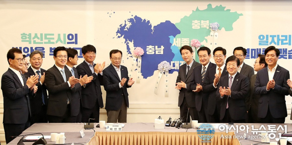 이 자리에서 이해찬 당대표와 이인영 원내대표는 협의회 공동주제인 '혁신도시', '공공기관', '일자리'가 적힌 꽃을 충청권 지도에 붙이는 퍼포먼스를 진행하며 충청권 상생발전에 힘을 실었다.