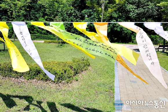 | 6일 세종시 오가냥뜰 근린공원에서 열린 보도연맹 희생자 위령제에서 참석자들이 오색종이에 쓴 추모글들이 바람에 날려 나부끼고 있다./아시아뉴스통신=홍근진 기자 |