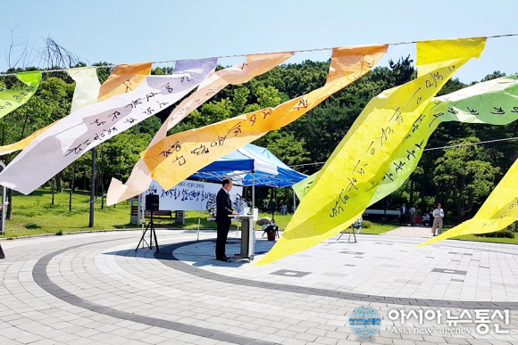 | 6일 세종시 오가냥뜰 근린공원에서 보도연맹 희생자 위령제가 열린 기운데 이강진 정무부시장이 추모사를 하고 있다./아시아뉴스통신=홍근진 기자 |