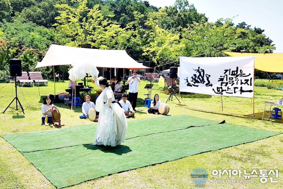 | 6일 세종시 오가냥뜰 근린공원에서 보도연맹 희생자 위령제가 열린 가운데 권덕순 캘리그라퍼 작품 앞에서 에스닉 풍류 연주에 맞춰 살풀이 춤을 추고 있는 안효정 씨의 모습./아시아뉴스통신=홍근진 기자 |