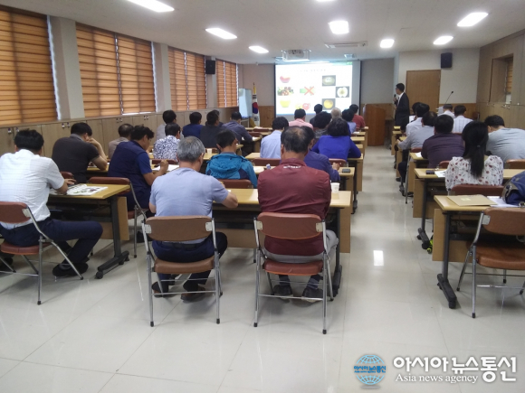 | 10일 함안 관내 수출 파프리카·토마토 농가 40여명을 대상으로 ‘일본 수출채소류 ID농가 교육’을 하고 있다.(사진제공=함안군청) |