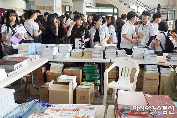 | 세종시교육청이 12~13일 고려대학교 세종캠퍼스에서 내년도 대학입시 정보 박람회를 개최하는 가운데 학생들이 각 대학 홍보자료를 받기 위해 기다리고 있다./아시아뉴스통신=홍근진 기자 |